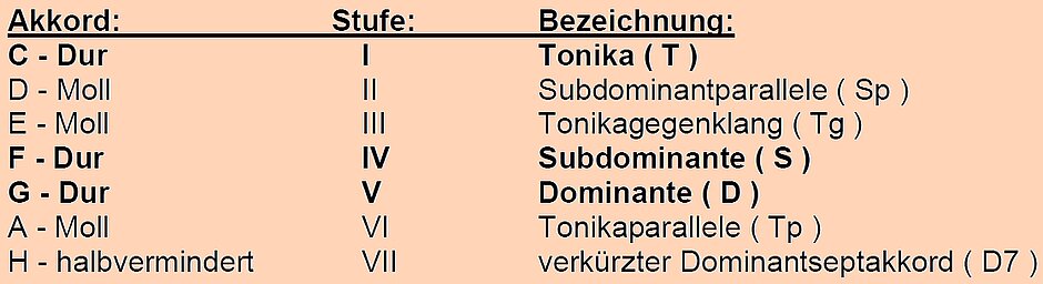 Die Akkorde haben auch eine feste Funktion. Es ist auffallend, dass auf bestimmte Akkorde immer auch bestimmte Andere Folgen. So spricht man zum einen von den "Stufen". Diese werden im Schriftlichen mit römischen Ziffern belegt, also z.B. in C-Dur: