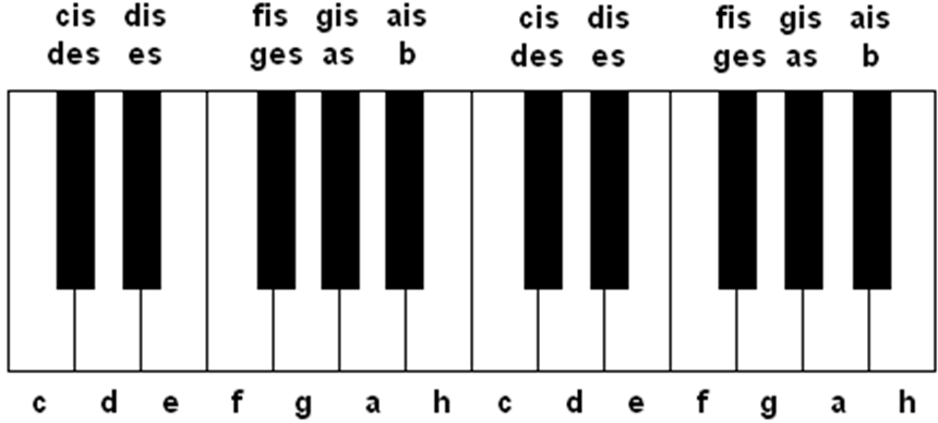 Alle Töne die nicht zur C - Dur Tonleiter gehören ( also alle schwarzen Tasten ) bekommen ein Vorzeichen. Wird C um einen Halbton erhöht wird daraus Cis. Wir D um einen Halbton erniedrigt wird daraus Des. In den Noten geschieht das mit Hilfe der Vorzeichen "#" und "b".