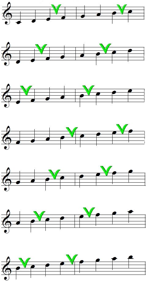 Zwischen E und F liegt kein weiterer Ton, also ist dieser Schritt (genau wie zwischen H und C) ein Halbtonschritt. Sieht man sich den Aufbau der C - Dur Tonleiter an, ergibt sich also diese Schrittfolge: