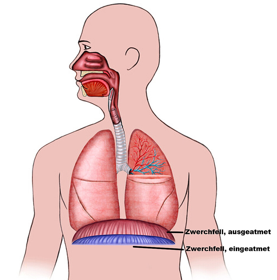 Zu allererst brauchen wir Luft zum Spielen. Je mehr, je besser. Unsere Lungen liegen wie in einem Käfig zwischen den Rippen. Deshalb können sie sich auch nur ganz wenig nach außen ausdehnen. Aber nach unten ist etwas mehr Platz und unsere Organe sind flexibel. Für die Ausdehnung der Lungen nach unten ist eine Muskel- Platte verantwortlich, die quer im Bauchraum liegt, Lunge und die anderen Organe voneinander trennt: das Zwerchfell! Glücklicherweise funktioniert unsere Atmung automatisch, sonst würden wir jede Nacht sterben. Das Zwerchfell ist also nicht unserem Willen unterlegen. Auf den Befehl: "rechten Zeigefinger ausstrecken" reagiert unser Körper - auf den Befehl: "Zwerchfell runter" leider nicht. Also wie bekommen wir den Vorgang unter Kontrolle?