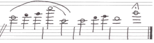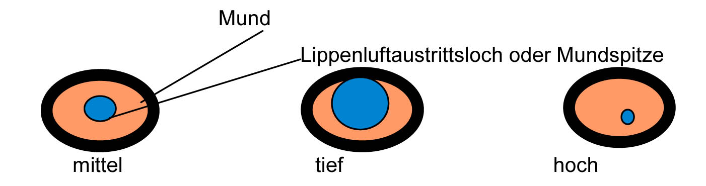 Meinen mittleren Ton fühle ich bei dem Ton f1. Wenn ich nach oben spiele, wird die Mundspitze gefühlsmäßig kleiner und umgekehrt. Das Lippenluftaustrittsloch wandert bei mir bei den hohen Tönen etwas nach unten zum Mundstückrand und bei den tiefen Tönen etwas nach oben.