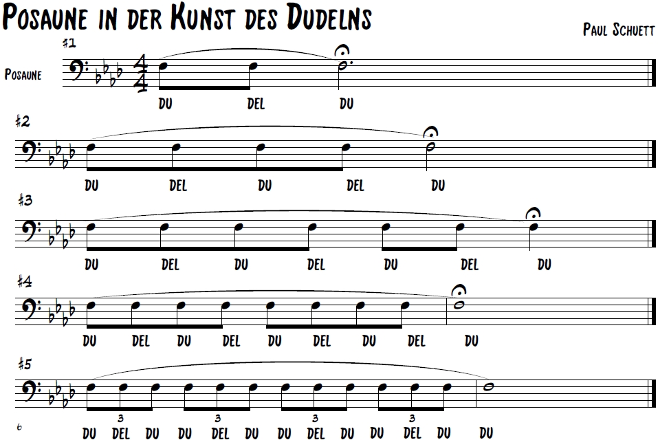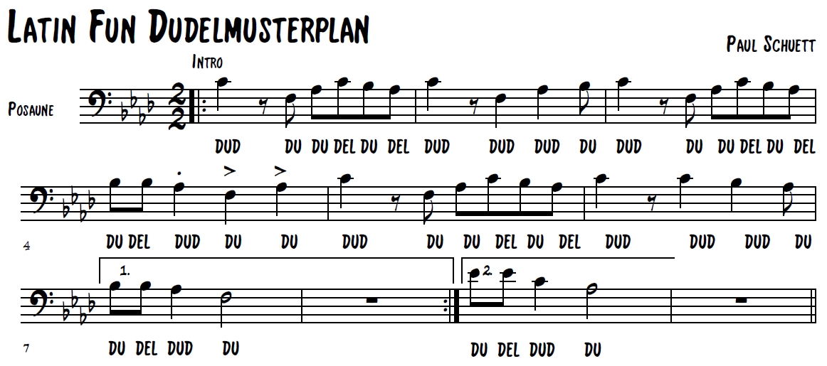 Themen zu dudeln heißt immer einen Wechsel zwischen einfacher- und Dudelzunge zu spielen. Es empfiehlt sich einen Dudelmusterplan oder auch seriellen Silbenmusterplan zu entwerfen, nachdem das Thema geübt wird.