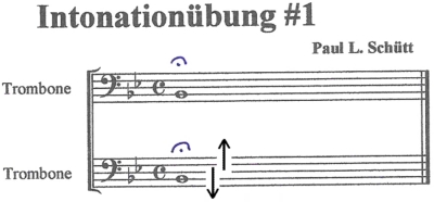Bei der ersten Übung spielen zwei Tubisten (oder auch alle anderen Instrumente) zur gleichen Zeit den gleichen Ton z. B. "Bb" (oder auch jeden anderen Ton). Tubist eins versucht konsequent die Tonhöhe zu halten, Tubist zwei versucht sich langsam nach oben oder unten zu bewegen.