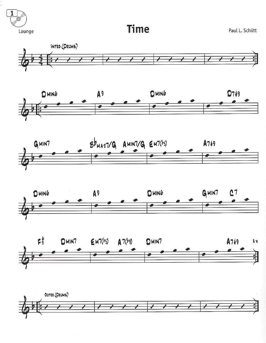 Zu Beginn ist der Ablauf der Stücke, mit je acht Takten Einleitung (Intro), den Harmonien und dem Ende (Outro) zu sehen. Die Notenköpfe zeigen die Magic Tones, die im Stück "Time", mit dem Anfangston "d", ohne zu wechseln, durch das gesamte Stück gespielt werden können. Danach folgt eine Zusammenfassung der Magic Tones, die im Stück vorkommen und einfache Übungen dazu.