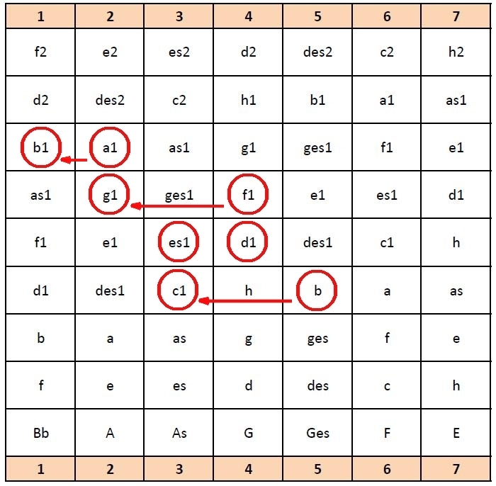 Um herauszufinden, welcher Ton jetzt besser geeignet ist, muss ich zunächst wissen wo die Töne überhaupt liegen. Auf dem Zugmusterplan sieht man Posaunenzüge von 1-7, mit den Tönen die man auf den einzelnen Positionen spielen kann.