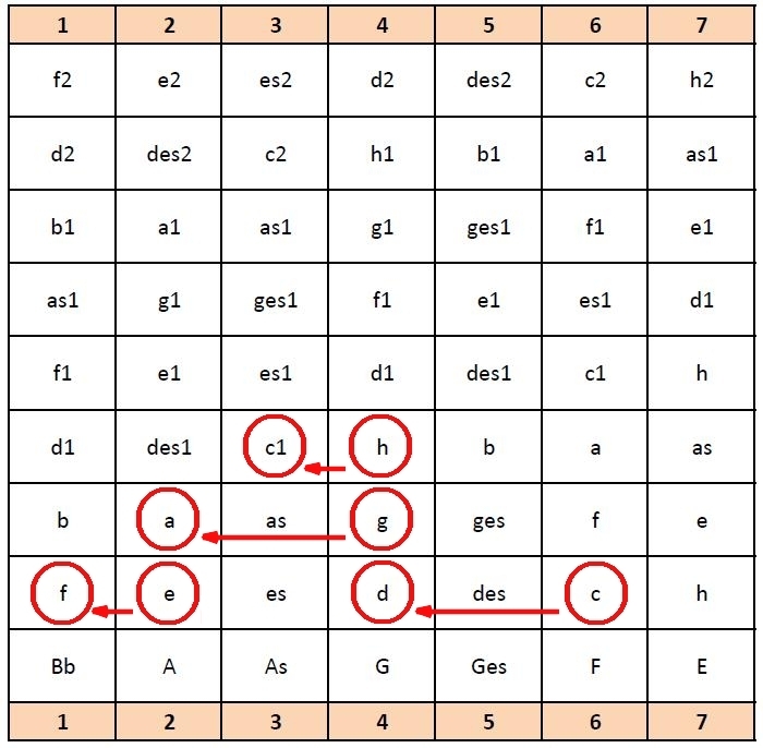 Bei den Tönen f und g zum Beispiel, wird beim Spielen mit Zugmusterplan, der Ton f immer auf der 6. Position gespielt.
