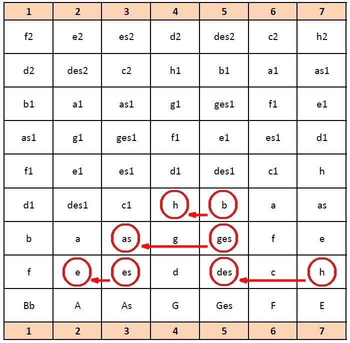Abschließend möchte ich noch die Tonleiter Bb-Dur besprechen, die natürlich genau so mit dem Zugmusterplan verschoben werden kann.