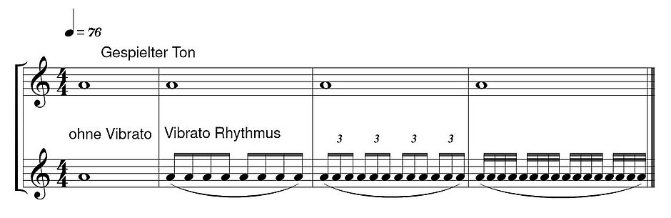 - Vibrato nie auf allen Tönen verwenden, oft sind bereits achtel Noten nicht mehr für ein Vibrato geeignet. Bei Stellen von nachgeordnetem Interesse wie z. B. in einer Orchestermusik, sollte das Vibrato möglichst wenig, fast unmerklich eingesetzt werden.