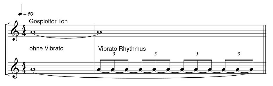 Die folgenden Übungen sind hilfreich eine rhythmische Kontrolle über das Vibrato zu erlangen. Die Übungen immer mit Metronom ausführen. Dabei den gesamten Tonumfang des Instruments berücksichtigen, um die Homogenität und Gleichmäßigkeit des Vibratos zu erhalten und eine Beherrschung aller Töne zu erlangen.