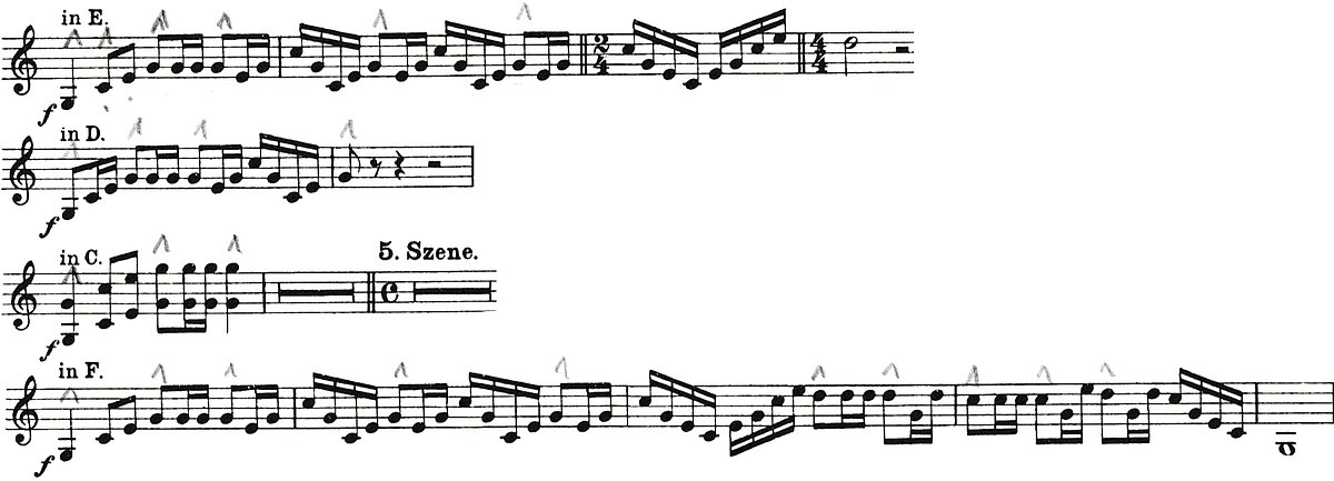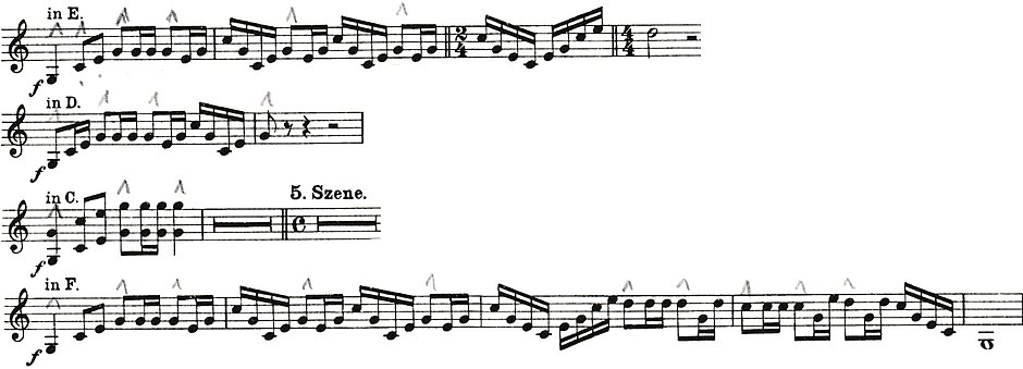Das Trompetenthema steht in D, E, F, und C. Die Notation ist stets C- Dur, doch da sich die Grundtonart im Orchester ändert, ändert sich hier nur die Transposition.