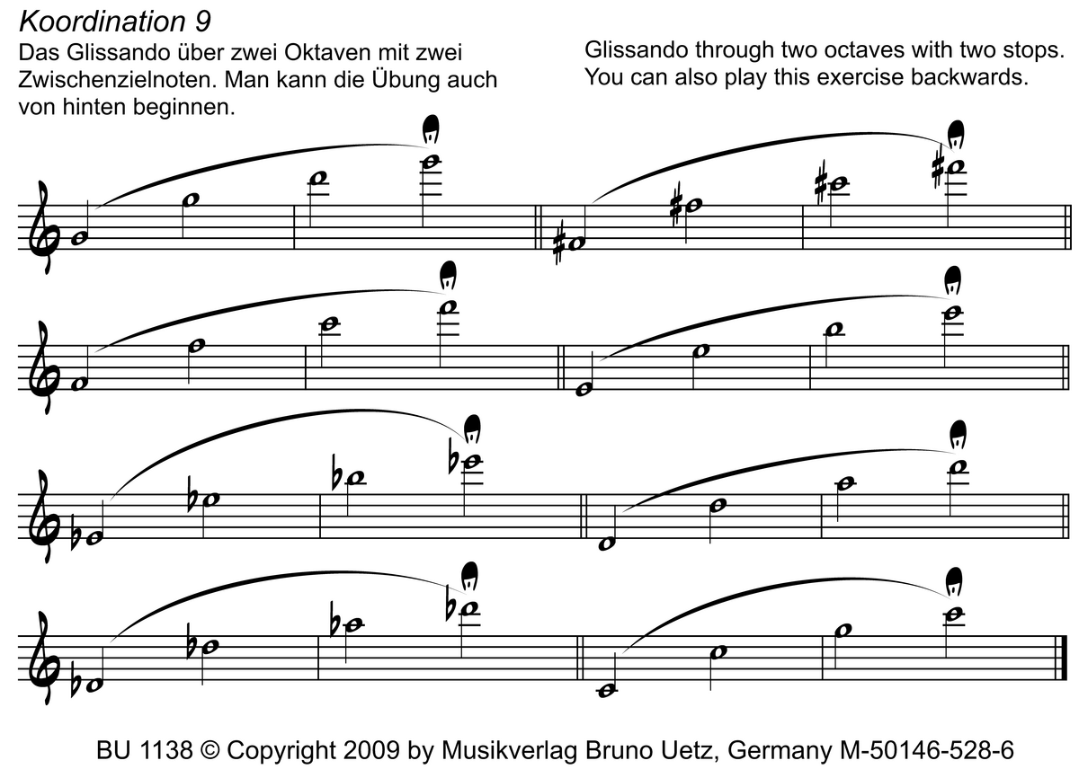 Außerdem sehr effektiv sind Glissandoübungen, da sie einen exakten Einsatz der Zunge fordern. Zuerst über ein dann auch über zwei Oktaven oder mehr.