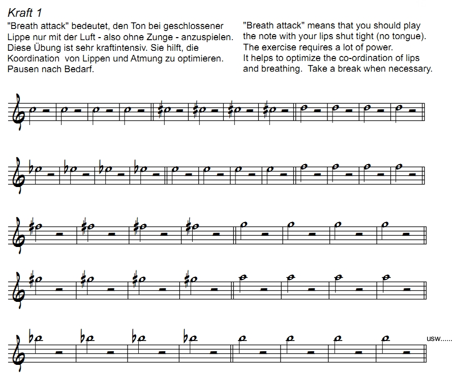 Hier entstehen die "PS" die man möglichst verlustfrei zu den Lippen zu bringen versucht. Eine sehr effiziente Übung dafür ist der "Breath Attack". Die Lippe ist geschlossen, der Ton wird nur mit der Luft angespielt. Dabei achtet man darauf, dass der Einsatz der "Stütze" und der Beginn des Tones genau zusammen liegen. Eine Möglichkeit wie man die Übung einsetzt sieht man in Übung 1:
