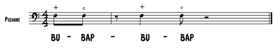 One of the most famous tunes played with a plunger mute is the opening theme of “Tuxedo Junction” by Erskine Hawkine and William Johnson (1939). The song title is derived from a railroad junction in Alabama. The “boo-bap-boo-bap” motif is played by the trombones and based on removing the mute from the bell. The score indicates the “boo” parts by means of a plus symbol (+) above the relevant notes, and the “bap” instances using an “o”. The plus symbol should be taken to mean “closed” or “covered”. The “o” is short for “open”. A plunger is a mute that is only used with brass instruments.
