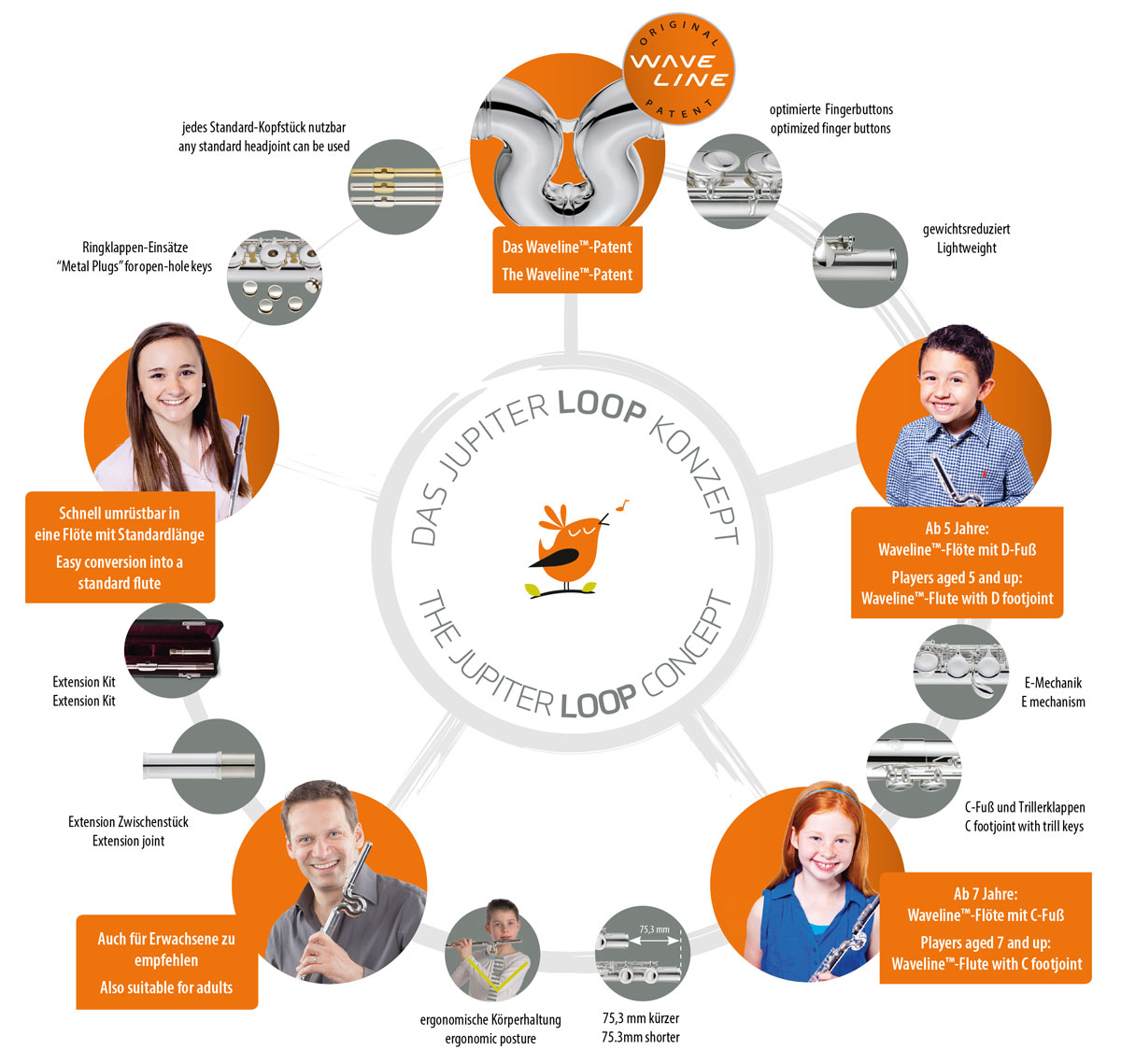 The new loop concept and the patented Waveline™-Flutes are a refinement of JUPITER’s endeavor to encourage young players to pick up the flute. This concept is now available in different sizes and ranges, which are perfect matches for the bodies of young players of different age groups.