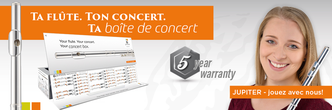 A l’achat d’une flûte traversière de la série JUPITER 700, nous offrons une garantie de 5 ans sur l’argenture, le jeu des axes et les tampons de la flûte dans le cadre de la promotion de la boîte de concert JUPITER.